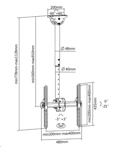 Stropný držiak televízie Fiber FN-T400 Stropný držiak na TV 32-60" plne polohovateľný, TOP kvalita Držiak na zaveste televízorov a monitorov na stropné konštrukcie. Držiak je plne nastaviteľný: otáčanie do strán, náklon, dĺžka od stropu, korekcia roviny, aj na šikmé stropy +/-60°, možnosť kolmého otočenia úchytu a inštalácie aj na zvislé plochy. Celoocelová konštrukcia s vynikajúcou pevnosťou, možnosť zavesiť televízory s hmotnosťou aj 50kg. Top kvalita, plná nastaviteľnosť, spoľahlivosť a bezpečnosť, to sú hlavné prednosti tohto stropného držiaku na televízory a monitory. Profesionálny stropný držiak na televízie aj monitory 32-65 palcov, otočný do strán, možnosť veľkého náklonu, dĺžkové nastavenie, systém skrytého vedenia káblov, nosnosť 50kg. Stropný držiak TV Fiber FN-T400 Technické údaje: nosnosť 50kg podpora VESA 200x100 až 400x400 na televízie a monitory s uhlopriečkou 32" až 60" (podľa VESA a hmotnosti aj väčšie) nastavenie dĺžky držiaka 560mm až 910mm otáčanie do strán +/- 180° náklon 0° až -25° korekcia roviny obrazu +/- 3° možnosť zaveste na vodorovné aj na šikmé stropné konštrukcie +/- 60° možnosť zaveste aj na zvislé plochy ocelová konštrukcia výbornej kvality systém pre skryté vedenie káblov farebné prevedenie čierne záruka 5 rokov Stropný držiak na televízie a monitory Fiber FN-T400 podporuje VESA štandardy: VESA 200x100 VESA 200x200 VESA 300x100 VESA 300x200 a 200x300 VESA 300x300 VESA 400x200 a 200x400 VESA 400x300 a 300x400 VESA 400x400
