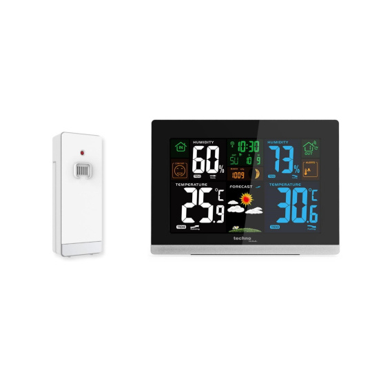 - barvy displeje: čas, datum zelená, barometrický tlak oranžová, vnitřní teplota a relativní vlhkost bílá, venkovní teplota a relativní vlhkost modrá