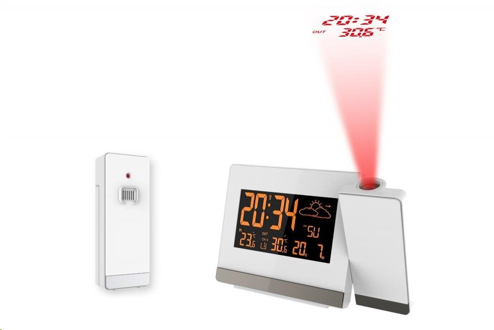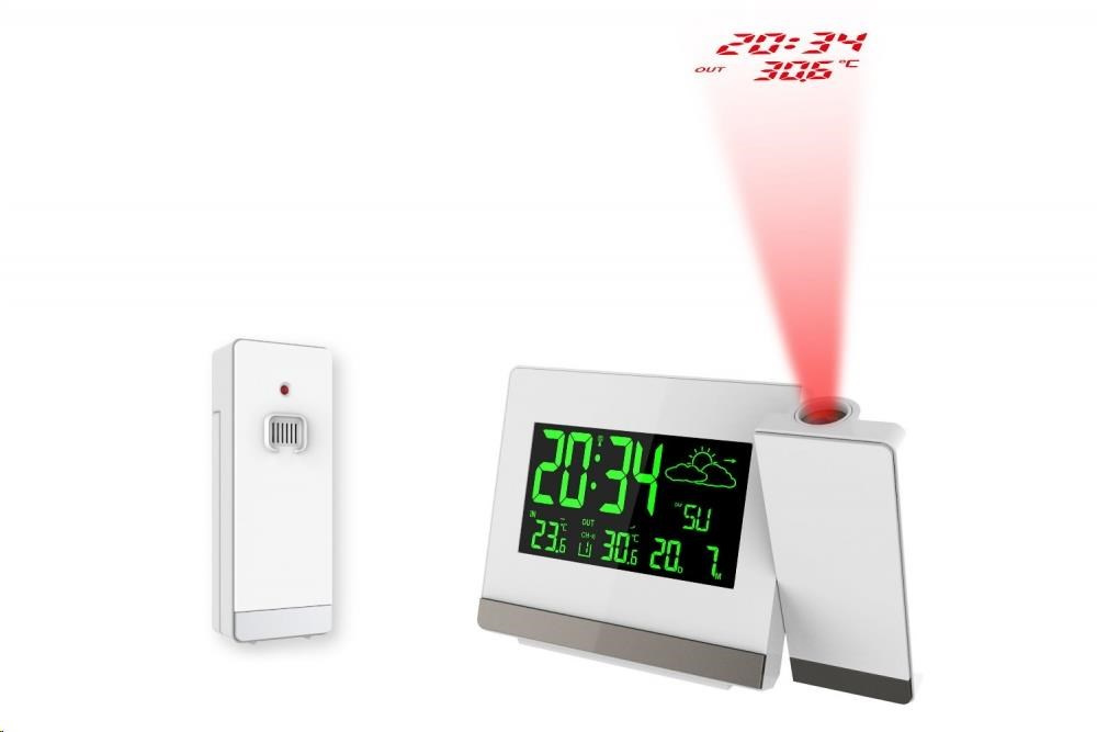 Meteorologická stanica s budíkom a projekciou času a vonkajšej / vnútorné teploty, predpoveďou počasia a farebným inverzným s možnosťou voľby nastavenia zobrazenia až z 256 farieb. barevný inverzný displej o rozmeroch 81 x 43 mm pri napájaní sieťovým adaptérom má osvetlenie displeja má tri stupne jasu a možnosť vypnutia, potom je možné krátkodobo zapnúť na 15 s, projekcia je stála pri napájaní batériami je možné krátkodobo zapnúť osvetlenie spolu s projekciou na 15 s lze nastaviť 256 farieb, alebo režim automatického plynulého striedania farieb možnosť rýchlej voľby 8 farieb osvetlenia displeja veľkosť číslic: čas 25 mm, dátum 9 mm, skratka názvu dňa 8 mm, teplota 10 mm čas riadený signálom DCF-77 s možnosťou manuálneho nastavenia ikona príjmu signálu DCF-77 12, alebo 24 hodinový formát zobrazenia času dátum, skratka názvu dňa (EN, FR, GE, SP, IT, NL, DK) časová zóna od -1 do +2 hodín 2 budíky funkcia opakovaného budenia (Snooze) po 5 minútach budenie zvukovým signálom (20 sekúnd 1 pípnutie za sekundu, 20 sekúnd 2 pípnutia za sekundu, 20 sekúnd 4 pípnutia za sekundu a potom stálo pípanie) striedavá projekcia času a vnútorné / vonkajšie teploty (teploty sa striedajú co 5 s) farba projekcie červená 5 animovaných ikon predpovede počasia (oblačno, čiastočne oblačno, jasno, zrážky, silné zrážky – možnosť búrky) možnosť nastavenia predvolenej ikony predpovede počasia meranie vnútorné teploty, meranie vonkajšej teploty bezdrôtovým snímačom pamäť na maximálne a minimálne namerané hodnoty vnútorné a vonkajšie teploty zobrazenie teploty vo °C alebo °F šipky vývoja vnútorné a vonkajšej teploty šipka vývoja barometrického tlaku možnosť použitia až 3 bezdrôtových snímačov model TX205 (jeden je súčasťou dodávky) bezdrôtový prenos hodnôt vonkajšej teploty na frekvencii 433 MHz indikácia slabých batérií farba biela rozmery 150 x 95 x 43 mm napájanie sieťový adaptér 230 - 240 V, 50 Hz, 50 mA / 4,5 V, 150 mA, 2 ks batérií 1,5 V typ AAA Bezdrôtový snímač (TX205) vodotesný kryt dosah signálu bezdrôtového snímača až 30 m v otvorenom priestore farba biela indikácia vysielania LED diódou rozmery 103 x 27 x 40 mm napájanie 2 ks batérií 1,5 V typ AA Obsah balenia: 1 x hlavná jednotka WT 549 1 x bezdrôtový snímač TX205 1 x sieťový adaptér návod CZ, EN, PL, GE, FR, SP, IT, NL