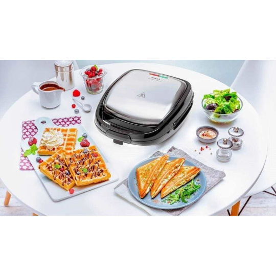Tefal Snack Time 2 v 1, multifunkčný prístroj s kovovou vložkou na prípravu trojuholníkových toastov a vaflí, predstavuje jedinečné riešenie, ktoré spája sendvičovač a vaflovač pre vždy dokonale sladké aj slané pochúťky. Navyše jeho kovový vzhľad dodá výrobku prémiový dizajn.