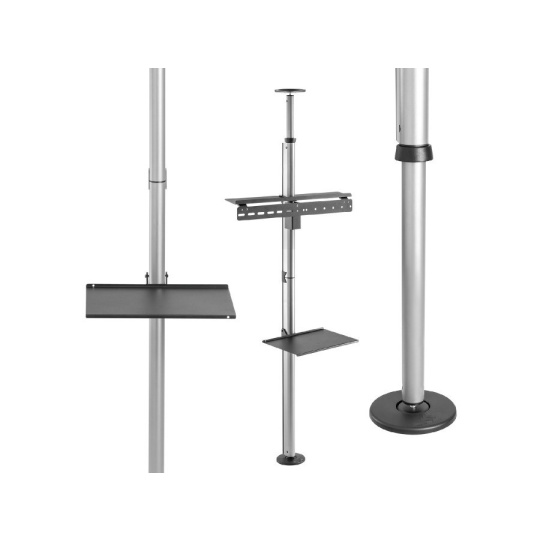 Držiak TV a polička na teleskopickej tyči Fiber Mounts M79C1N Špeciálny držiak TV 43-70" na teleskopickej tyči s nastaviteľnou dĺžkou 210-270cm, nosnosťou 30kg Máte obmedzený priestor alebo nemôžete inštalovať držiak do steny? Chcete upevniť televíziu kamkoľvek do priestoru a nastaviť jej výšku? To všetko Vám umožní špeciálna teleskopická tyč M79C1N s nastaviteľnou dĺžkou 210cm až 270cm, držiakom na televízie 43-70" a poličkou na príslušenstvo. Držiak aj polička sú výškovo nastaviteľné. Nosnosť 30kg, farebné prevedenie strieborné. Teleskopická tyč s nastaviteľnou dĺžkou 210-270cm s držiakom TV a poličkou, inštalácia podlaha-strop Fiber Mounts M79C1N Technické údaje: nosnosť 30kg na LCD, LED, QLED televízie 37-70" podpora VESA 200x200 až 600x400 inštalácia podlaha - strop 210-270cm nastavenie výšky držiaku TV 870-1625mm nastavenie výšky police 50-850mm / nosnosť police 5kg systém pre skryté vedenie káblov pevná, spoľahlivá konštrukcia inštalačný materiál farebné prevedenie strieborné záruka 3 roky Teleskopický držiak TV podlaha - strop s poličkou Fiber Mounts M79C1N Držiak na TV podporuje VESA štandardy: VESA 200x200 VESA 300x200 a 200x300 VESA 300x300 VESA 400x200 a 200x400 VESA 400x300 a 300x400 VESA 400x400 VESA 600x200 VESA 600x400