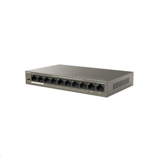 Tenda TEF1110P-8-63W prepína dáta pomocou 10 portov RJ45, 8 portov 10/100 Mbps podporuje PoE802.3af/at + 2 porty 10/100 Mbps pre Uplink. Spínač má ochranu proti prepätiu 6 kV. Podpora prepínania uzlov typu Store-and-Forward. Plne duplexné riadenie toku 802.3x, poloduplexné riadenie toku v režime Back-Pressure. Dva porty Uplink možno použiť na pripojenie prepínača k sieti a druhý na pripojenie iného zariadenia bez PoE, napr. NVR a ďalšie.