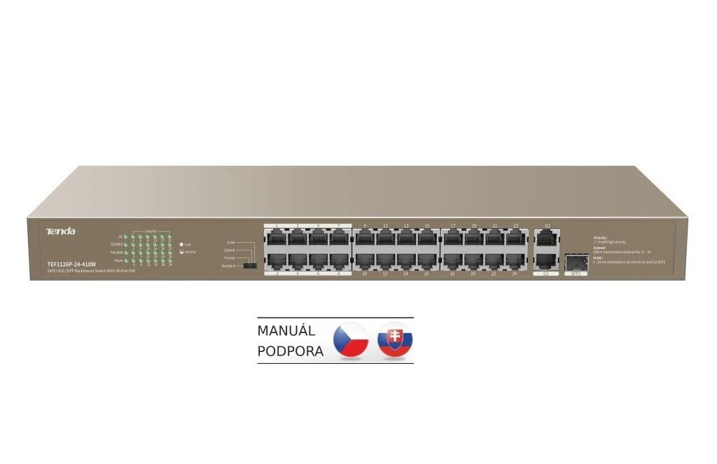Tenda TEF1126P-24-410W je 26portový PoE switch s PoE af/at a SFP napájaním. 24 portov 10/100 Mbps s PoE 802.3af/at (spolu 370 W) + 1x RJ45 10/100/1000 Mbps + 1xCombo RJ45/SFP 100/1000 Mbps pre Uplink. Montáž do stojana, veľkosť prepínača 19". Prepäťová ochrana 6 kV. Podpora VLAN.