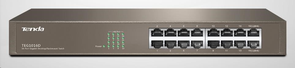 Tenda TEG1016D 16-portový gigabitový ethernetový prepínač, 10/100/1000 Mb/s, bez ventilátora, montáž do racku