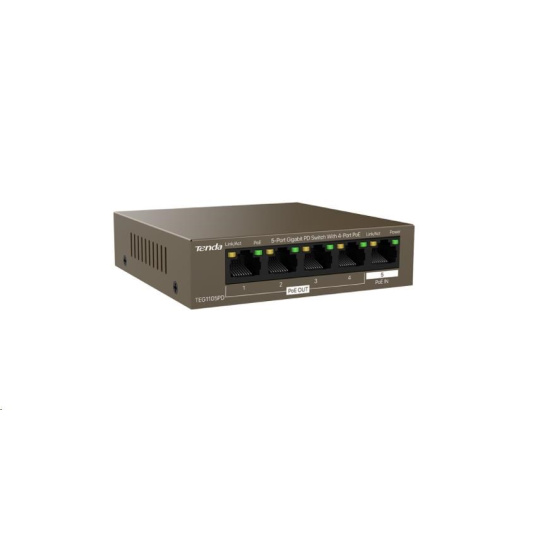 Tenda TEG1105PD prepínača prenáša dáta pomocou 5 portov RJ45 s prenosovou rýchlosťou 10/100/1000 Mb/s s automatickou detekciou rýchlosti. Port 5 je určený na pripojenie do siete a tiež na napájanie switchu. Je nutné do tohto portu "posielať" tiež PoE napájanie IEEE 802.3at 30W z predchádzajúceho zariadenia v sieti. Zostávajúce 4 PoE porty podporujú PoE 802.3af na napájanie ďalších koncových zariadení. Switch podporuje stabilné 8-jadrové PoE napájanie, ochranu proti prepätiu 6kV. Podpora prepájaní uzlov v móde Store-and-Forward. Full-duplex kontrola toku 802.3x, half-duplex kontrola toku v režime Back-Pressure. Switch je tiež vhodný do kancelárií, pretože neobsahuje žiadne ventilátory, je fanless. Tenda TEG1105PD je vhodná ako do veľkých náročných projektov, tak aj do menších a stredných podnikov a domácností.