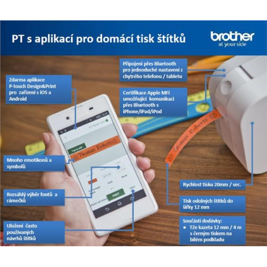 Tlačiareň štítkov BROTHER PT-P300 - 12 mm, TZe pásky, BT, iOS 9, Android 4.1 a vyššie, Apple MFi, BT ver. 2.1, 20 mm/s