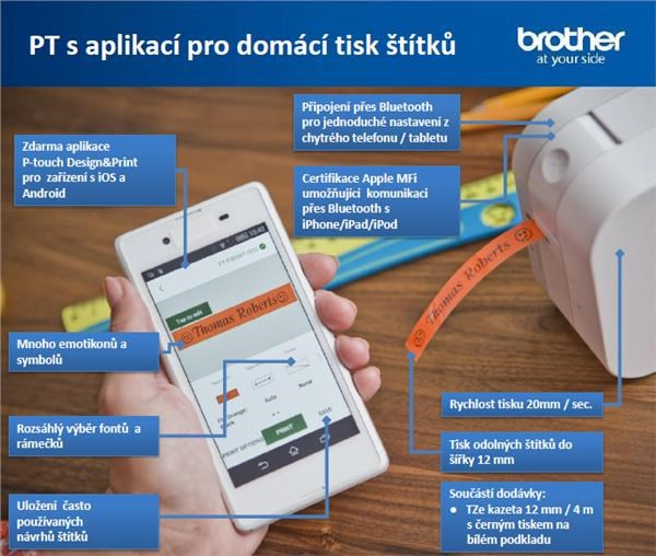 Tlačiareň štítkov BROTHER PT-P300 - 12 mm, TZe pásky, BT, iOS 9, Android 4.1 a vyššie, Apple MFi, BT ver. 2.1, 20 mm/s