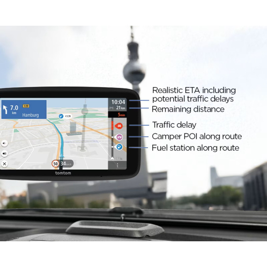 Zoznámte sa s druhou generáciou TomTom GO Camper Tour, navrhnutou špeciálne pre milovníkov karavaningu. Užívajte si prispôsobené trasy, body záujmu a špičkové mapy TomTom s integrovanou dopravnou službou TomTom Traffic.