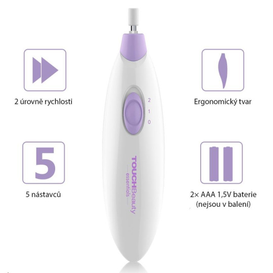 - Súprava s 5 nástavcami - čistí, opravuje, tvaruje, ostrie, brúsia, leštia nechty, odstraňuje mozole.
