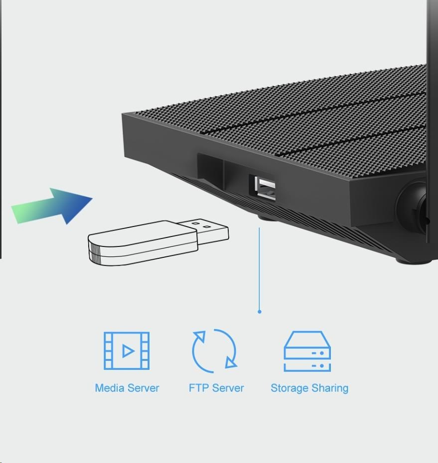 - USB port na pripojenie flash disku či HDD (media server, zdieľanie úložiska, FTP server)