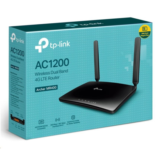 | Package Contents | AC1200 Wireless Dual Band 4G LTE Router, Archer MR400 RJ45 Ethernetový Kábel Napájací adaptér Rýchly inštalačný sprievodca |