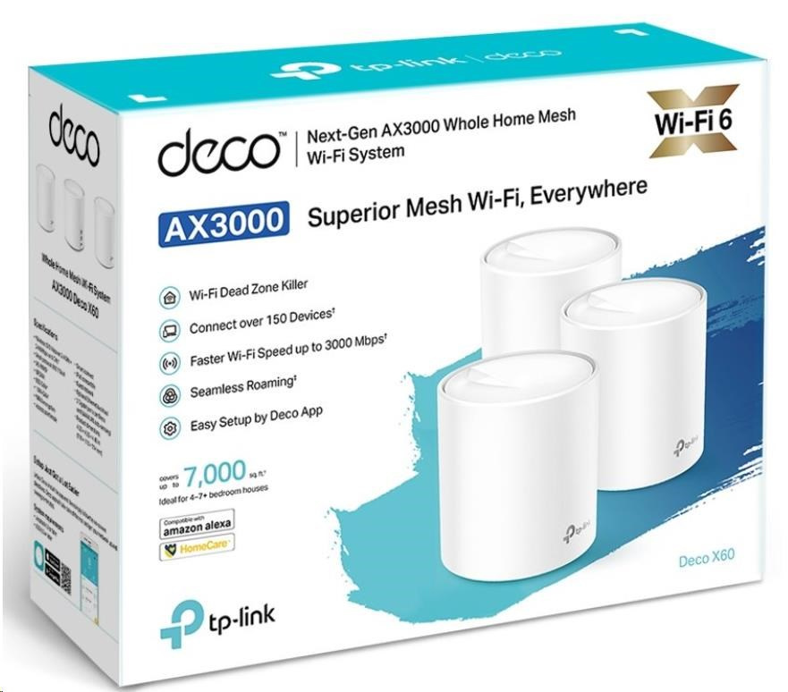 | Balenie obsahuje | Deco X60 (3-pack) 3 Deco X60 jednotky 1 RJ45 Ethernet kábel 3 napájacie adaptéry Rýchly sprievodca inštaláciou Deco X60 (2-pack) 2 Deco X60 jednotky 1 RJ45 Ethernet kábel 2 napájacie adaptéry Rýchly sprievodca inštaláciou Deco X60 (1-pack) 1 Deco X60 jednotka 1 RJ45 Ethernet kábel 1 napájací adaptér Rýchly sprievodca inštaláciou |