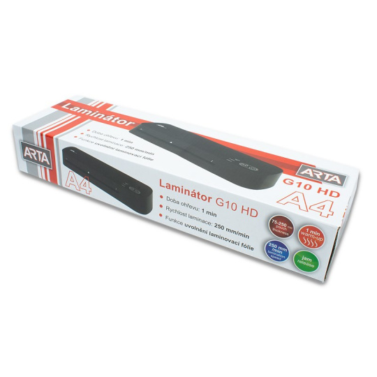 Laminátor dokumentov s možnosťou voľby hrúbky laminovacej fólie. Model ARTA G10 HD A4 umožňuje laminovanie dokumentov, ktoré majú maximálnu šírku 235 mm (A4), s fóliami o hrúbke 75 až 250 mikrónov.  Doba potrebná na zohrievanie je iba 60 sekúnd. Je ľahko použiteľný, malý, kompaktný a vyniká prítomnosťou inteligentnej funkcie automatického vypnutia po 30 minútach nečinnosti. Súčasťou je tiež možnosť uvoľnenia zaseknutých dokumentov.