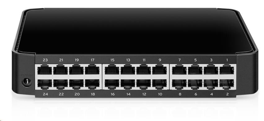 - 24 portov 10/100 Mbit/s RJ45 s podporou automatického vyjednávania a Auto MDI/MDIX