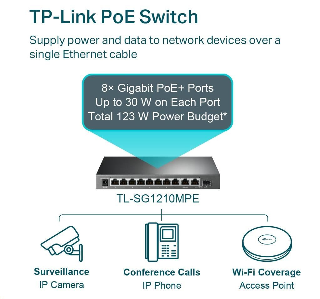 TP-Link CCTV Easy Smart switch TL-SG1210MPE (8xGbE, 1xGbE uplink, 1xGbE/SFP combo uplink, 8xPoE+, 123W, fanless)