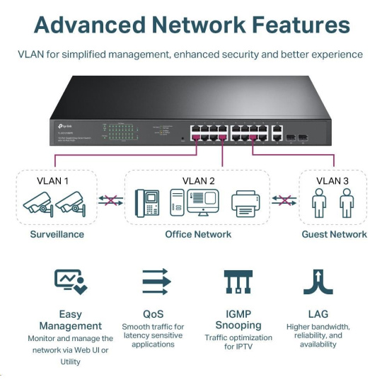 Vyhovuje štandardu 802.3af/at PoE+, ktorý podporuje až 30 W na každom portu PoE. Celkový rozpočet napájania 250 W PoE pre 16 gigabitových portov PoE+ umožňuje široké možnosti využitia, napríklad pre dohľadové systémy pre kancelárie, studentské koleje a malé firmy. Je plne kompatibilný s IP kamerami, prístupovými bodmi, IP telefónmi, počítačmi, tlačiarňami a ďalšími zariadeniami.