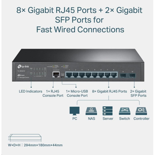 - Plne gigabitové porty -8 gigabitových portov RJ45 a 2 porty SFP poskytujú vysokorýchlostné pripojenie.