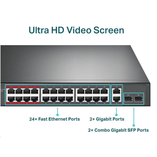 TP-Link CCTV switch TL-SL1226P (24x100Mb/s, 2xGbE/2xSFP combo, 24xPoE+, 250W)