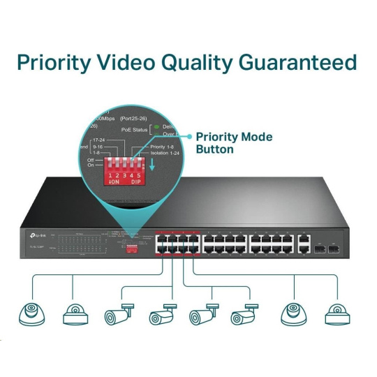 - Prioritný režim zabezpečuje vysokú prioritu portov 1–8 a zaručuje kvalitu citlivých aplikácií, ako je video monitor