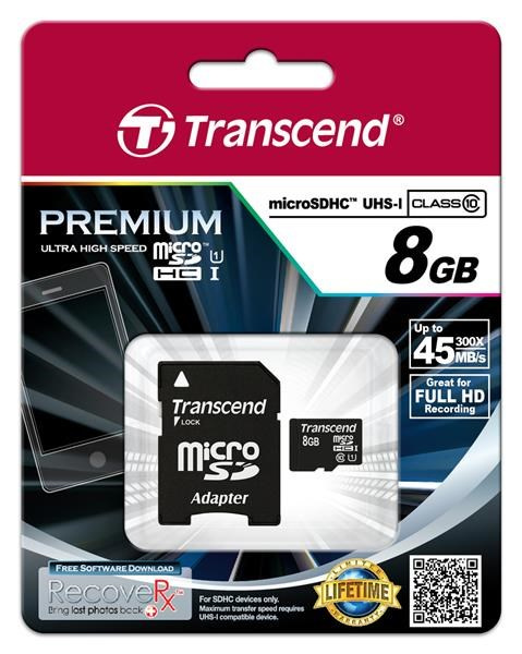 Karta TRANSCEND MicroSDHC 8GB Premium, Class 10 UHS-I 300x + adaptér