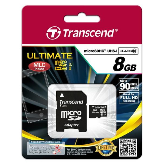 Karta TRANSCEND MicroSDHC 8GB Ultimate, Class 10 UHS-I 600x, MLC + adaptér