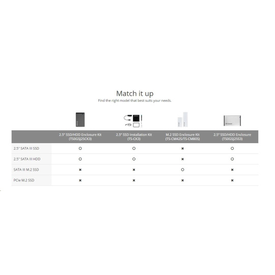 Transcend's 2.súprava 5" krytu SSD/HDD obsahuje 2.5-palcový kryt s vonkajším gumovým puzdrom, vnútorným gumovým tlmičom nárazov, adaptérom SATA, káblom USB, 7 mm na 9.5 mm dištančnú podložku, skrutkovač PH1 a tri montážne skrutky M2.