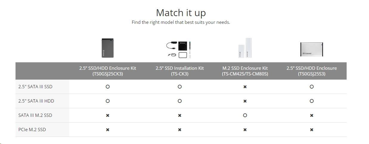 Transcend's 2.súprava 5" krytu SSD/HDD obsahuje 2.5-palcový kryt s vonkajším gumovým puzdrom, vnútorným gumovým tlmičom nárazov, adaptérom SATA, káblom USB, 7 mm na 9.5 mm dištančnú podložku, skrutkovač PH1 a tri montážne skrutky M2.