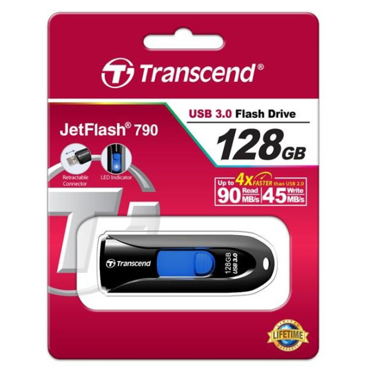TRANSCEND Flash disk 128 GB JetFlash®790, USB 3.1 (R:90/W:40 MB/s) čierna/modrá