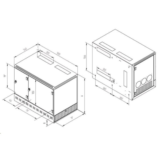 káblový vstup je rovnaký ako na hornej a spodnej stene skrinky. Priechod káblov medzi sekciami je umožnený prestupmi na stredovej priečke. Všetky káblové vstupy majú vylamovacie zástrčky.