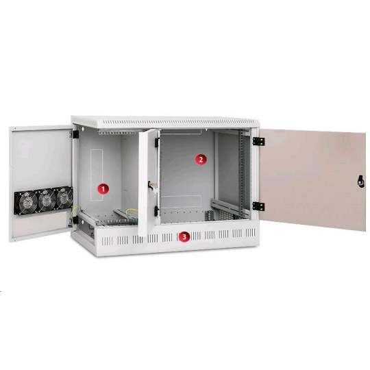 Chladenie vetraním vďaka perforácii skeletu a bočných dverí je možné podporiť inštaláciou ventilátorov pre nástenné skrine (RAX-CH-X07)