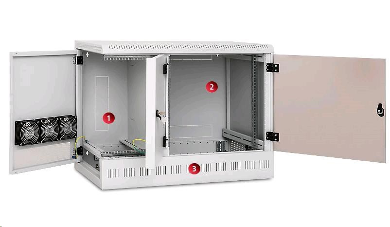 Chladenie vetraním vďaka perforácii skeletu a bočných dverí je možné podporiť inštaláciou ventilátorov pre nástenné skrine (RAX-CH-X07)