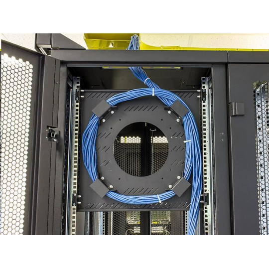 držiak je možné inštalovať vertikálne (10U) na 19" vertikálne lišty (zvyčajne na zadnej strane racku) alebo otočením držiakov horizontálne medzi vertikály ako klasickú policu. Podporné hroty namontované okolo centrálneho otvoru zabezpečujú polomer ohybu uložených káblov a zabraňujú ich poškodeniu.