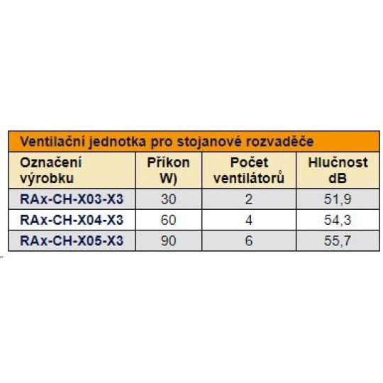 Ventilačná jednotka pre stojanové rozvádzače - inštaluje sa do uzáveru z vonkajšej strany rozvádzača, do základne z vnútornej strany rozvádzača. Pri inštalácii do základne skrine sa musí použiť montážny rám spodnej ventilačnej jednotky - RAx-CH-Xxx-X1, ktorý sa inštaluje pomocou obojstrannej lepiacej pásky.