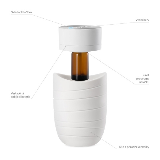 Difúzer vďaka jeho kompaktným rozmerom môžete ľahko prenášať a užívať si tak benefitov aromaterapie doma aj v práci, a to dlhé hodiny. Batéria v závislosti od použitého režimu vydrží 23, 16 alebo 12 hodín a akonáhle poklesne jej kapacita, difuzér vás upozorní a potom sa vypne. Dobíjanie prebieha cez USB-C priamo v tele difuzéra. Každý interiér difuzér nielen prevonia, ale aj ozdobí svojim dizajnom a prírodným telom vyrobeným z keramiky.