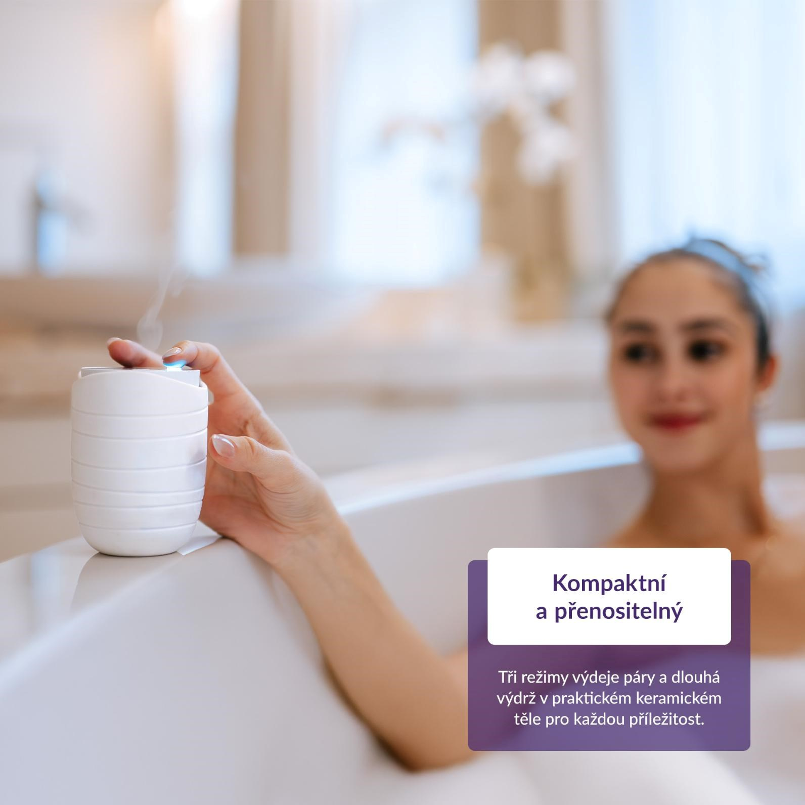 Difúzer vďaka jeho kompaktným rozmerom môžete ľahko prenášať a užívať si tak benefitov aromaterapie doma aj v práci, a to dlhé hodiny. Batéria v závislosti od použitého režimu vydrží 23, 16 alebo 12 hodín a akonáhle poklesne jej kapacita, difuzér vás upozorní a potom sa vypne. Dobíjanie prebieha cez USB-C priamo v tele difuzéra. Každý interiér difuzér nielen prevonia, ale aj ozdobí svojim dizajnom a prírodným telom vyrobeným z keramiky.