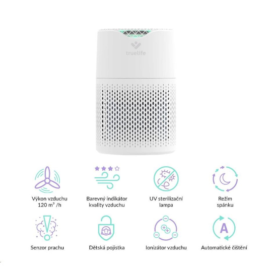 Čistička vzduchu TrueLife vyčistí až 120 m3 vzduchu za hodinu. Je vhodná do miestnosti o veľkosti 12-18 m2 a vďaka nízkej hmotnosti ju môžete bez obáv prenášať. Čistička celkovo zlepšuje kvalitu vzduchu, ničí vírusy, baktérie a iné nečistoty a môže tak významne pomôcť alergikom alebo astmatikom. Čistička je vybavená farebnými indikátormi kvality vzduchu, funkciou automatickej detekcie nečistôt a automatickým čistením. Ak bývate na mieste, kde sa často prachuje, poteší vás prítomnosť prachového senzora. 6-násobná filtračná sústava v podobe anti-bakteriálneho filtra, HEPA filtra, uhlíkového filtra, katalytického filtra, UV svetla a ionizácie zachytí až 99,9 % častíc prachu a vyčistí 93,5 % VOC látok. Zároveň zachytáva vírusy a koronavírusy.