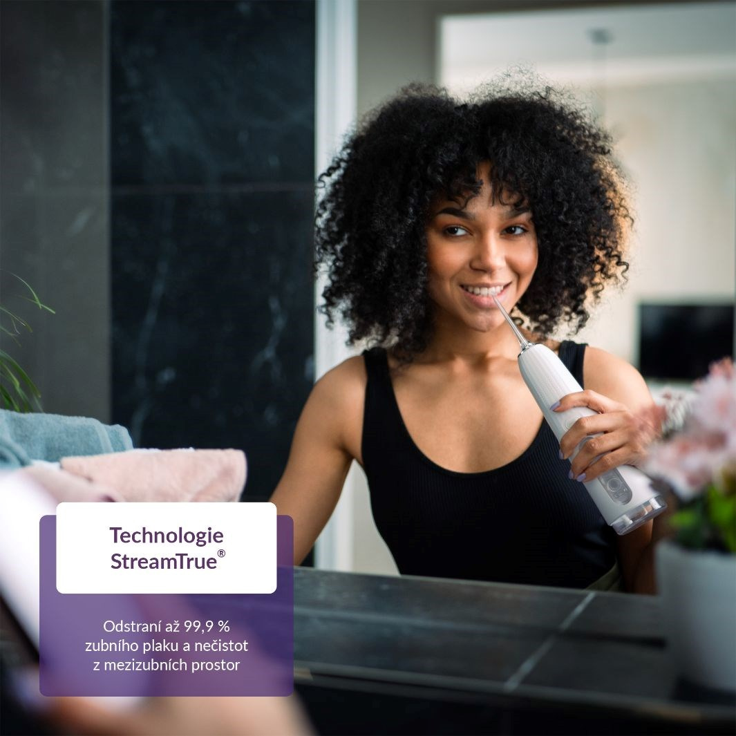 Pravidelné čistenie medzizubných priestorov funguje ako prevencia zubných kazov a vďaka TrueLife AquaFloss Compact C200 je jednoduchšie aj šetrnejšie, než používanie zubných nití či medzizubných kefiek. Iba zhora či z boku naplníte nádržku s objemom 300 ml vodou a zvolíte jeden z 5 prednastavených režimov, pričom pri režime DIY si svojim potrebám prispôsobíte tlak. Sprcha je tiež vybavená technológiou StreamTrue®, ktorá vháňa mikrobublinky tvorené vodou a vzduchom aj do tých najužších priestorov a účinne tak odstraňuje zubný povlak, baktérie a zvyšky jedál.