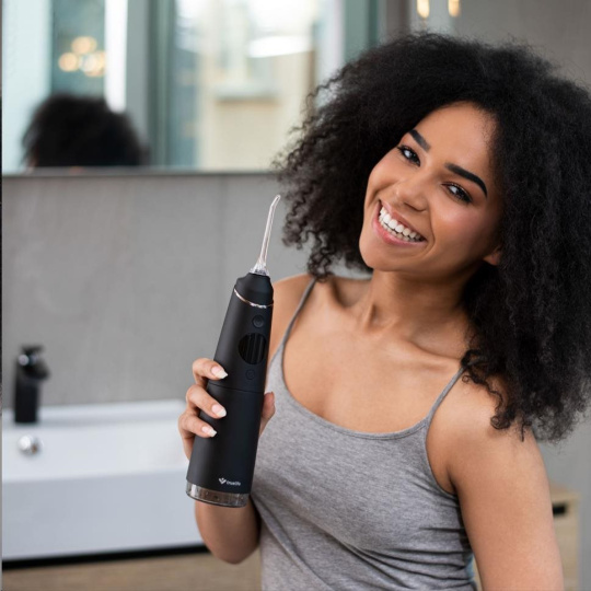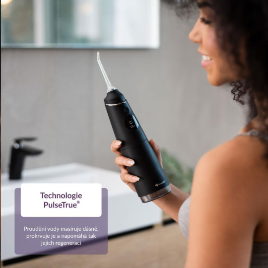 Úplná väčšina zubných kazov vzniká v medzizubných priestoroch. Ich pravidelné čistenie je preto nutnosť. Býva ale zdĺhavé a často nie úplne príjemné. S ústnou sprchou TrueLife AquaFloss Compact C300 je čistenie medzizubných priestorov o mnoho jednoduchšie a šetrnejšie. Vďaka technológii StreamTrue® prúd kvapiek vody a vzduchu, ktorý vychádza z trysky ústnej sprchy, dokonale prenikne aj do najmenších priestorov, kde účinne odstraňuje až 99 % zubného povlaku i baktérií. Vďaka kompaktnému dizajnu a výdrži batérie môžete so sprchou bez obáv cestovať. Jej používanie je ľahké a vyžaduje minimum nácviku. Sprcha ponúka 5 režimov čistenia s rôznymi intenzitami tlaku, vrátane režimu Pulse s technologiou PulseTrue®, vďaka ktorej prístroj masíruje ďasná, prekrvuje ich a napomáha tak ich regenerácii. Vďaka funkcii DIY si môžete vytvoriť vlastný režim čistenia, v ktorom si zvolíte intenzitu tlaku vody, ktorá vám bude najviac vyhovovať. Prístroj má 6 špeciálnych trysiek, ktoré sú navrhnuté pre vaše konkrétne potreby.