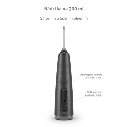 Nádržka o objeme 300 ml vystačí na vyčistenie celého chrupu a zároveň je dostatočne kompaktná. Okrem obyčajnej vody ju môžete naplniť ústnou vodou pre extra sviežosť.