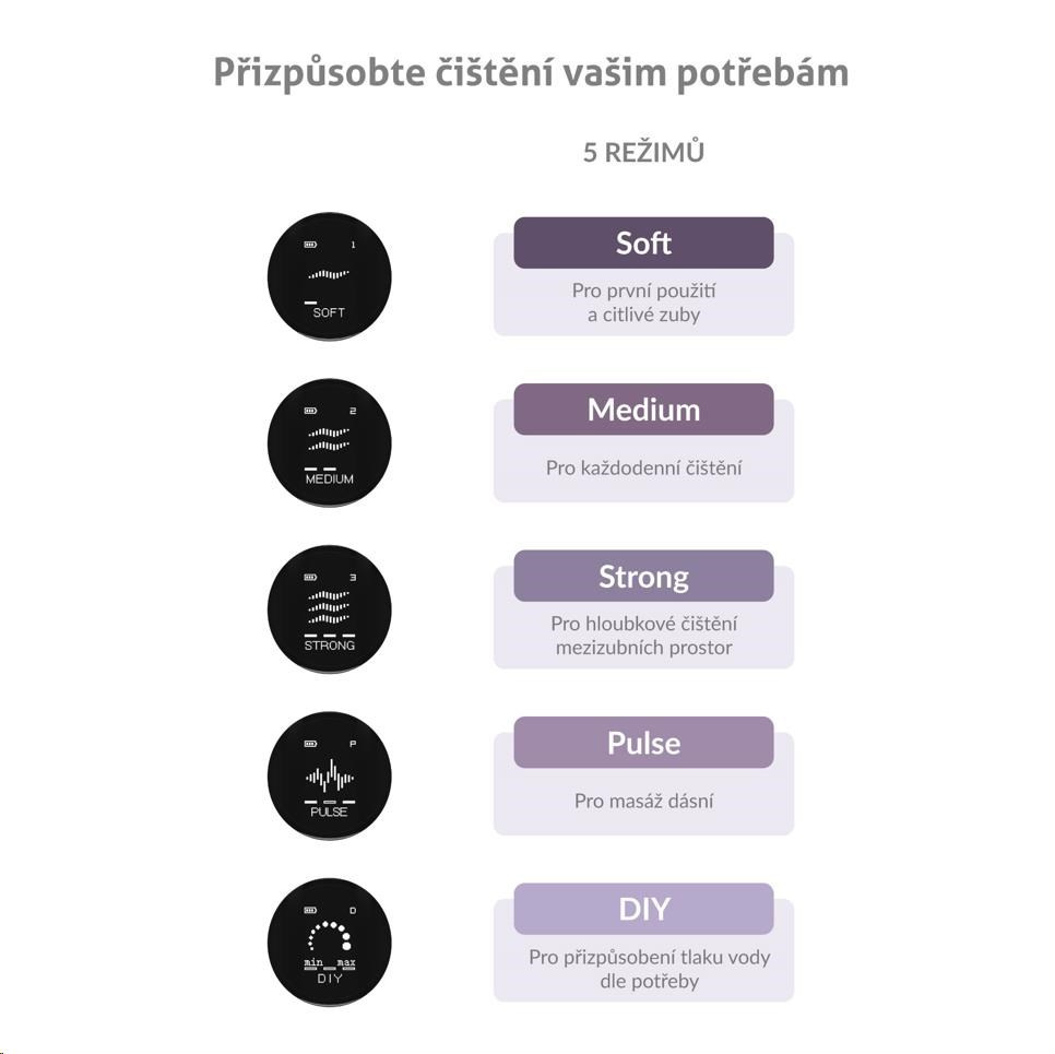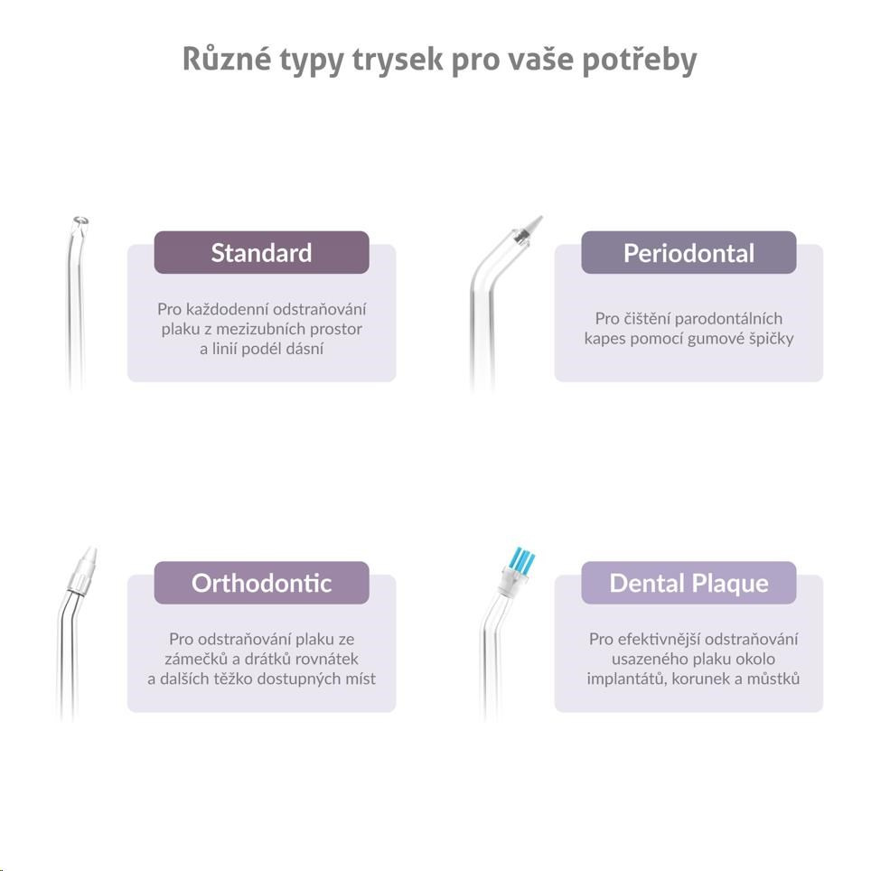 Súčasťou balenia je 6 rôznych druhov trysiek C-series, sprchu tak môže využívať celá rodina. Ďalšie trysky pre rôzne dentálne potreby je prípadne možné dokúpiť.