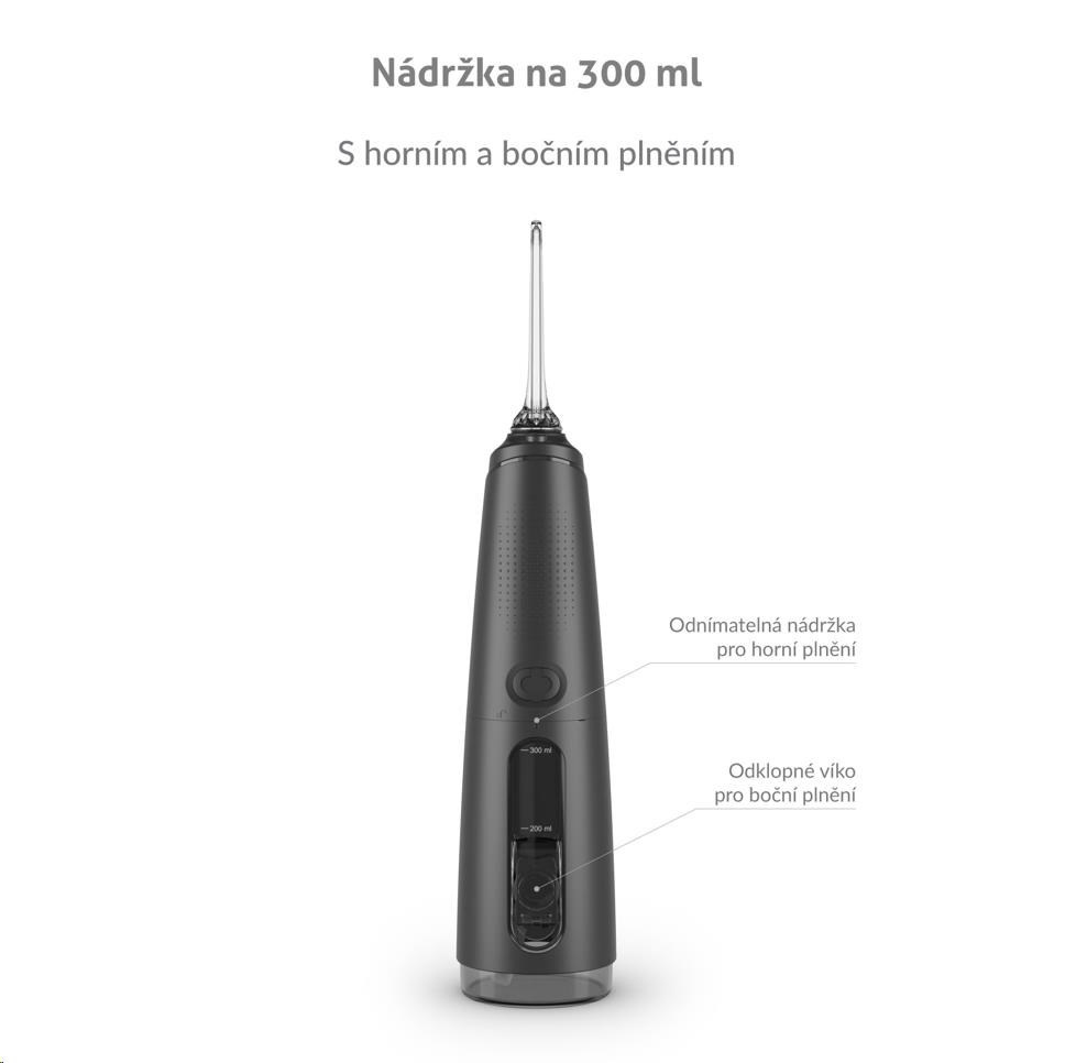 Nádržka o objeme 300 ml vystačí na vyčistenie celého chrupu a zároveň je dostatočne kompaktná. Okrem obyčajnej vody ju môžete naplniť ústnou vodou pre extra sviežosť.