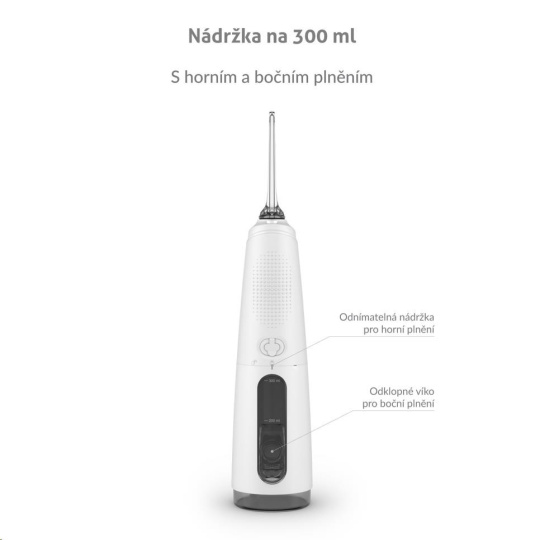 Nádržka o objeme 300 ml vystačí na vyčistenie celého chrupu a zároveň je dostatočne kompaktná. Okrem obyčajnej vody ju môžete naplniť ústnou vodou pre extra sviežosť.