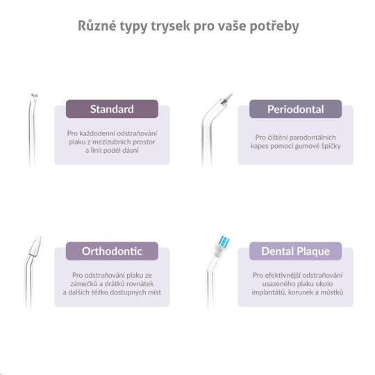 Súčasťou balenia je 6 rôznych druhov trysiek C-series, sprchu tak môže využívať celá rodina. Ďalšie trysky pre rôzne dentálne potreby je prípadne možné dokúpiť.