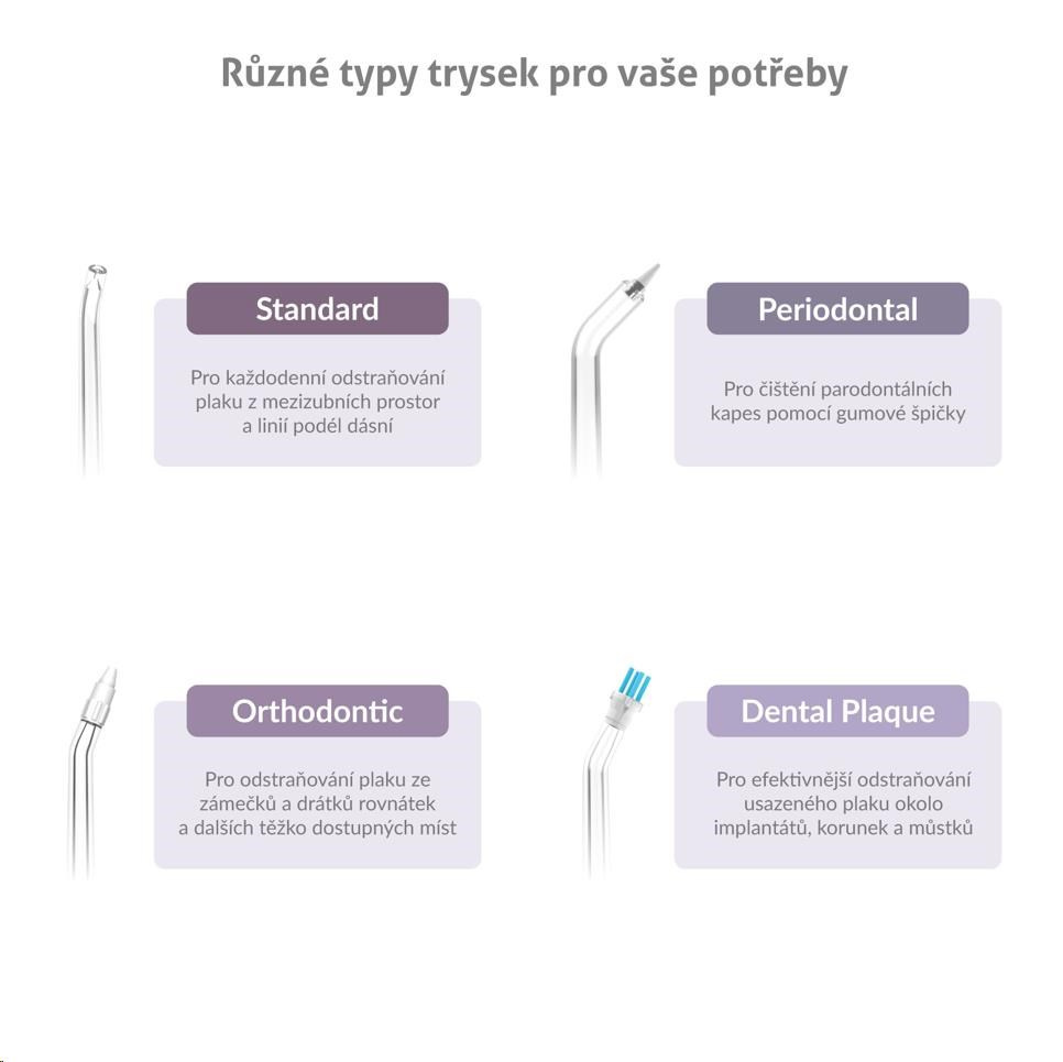 Súčasťou balenia je 6 rôznych druhov trysiek C-series, sprchu tak môže využívať celá rodina. Ďalšie trysky pre rôzne dentálne potreby je prípadne možné dokúpiť.