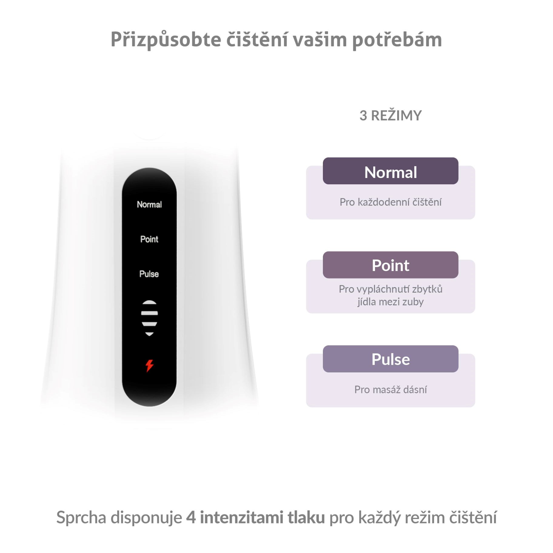 Sprcha ponúka 3 režimy čistenia s rôznymi intenzitami tlaku (30 – 130 PSI), vrátane režimu POINT, ktorý cielene a účinne odstráni zvyšky jedla z medzizubných priestorov.