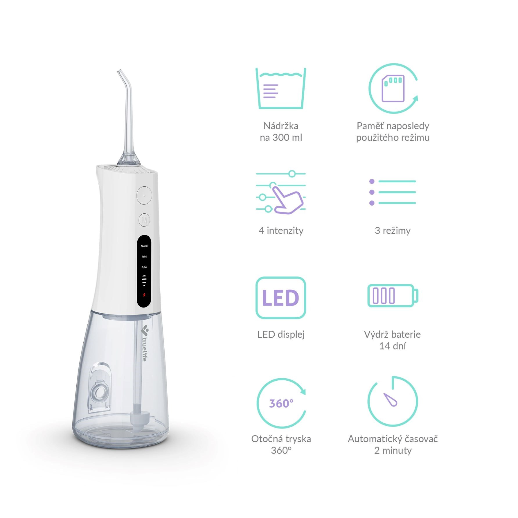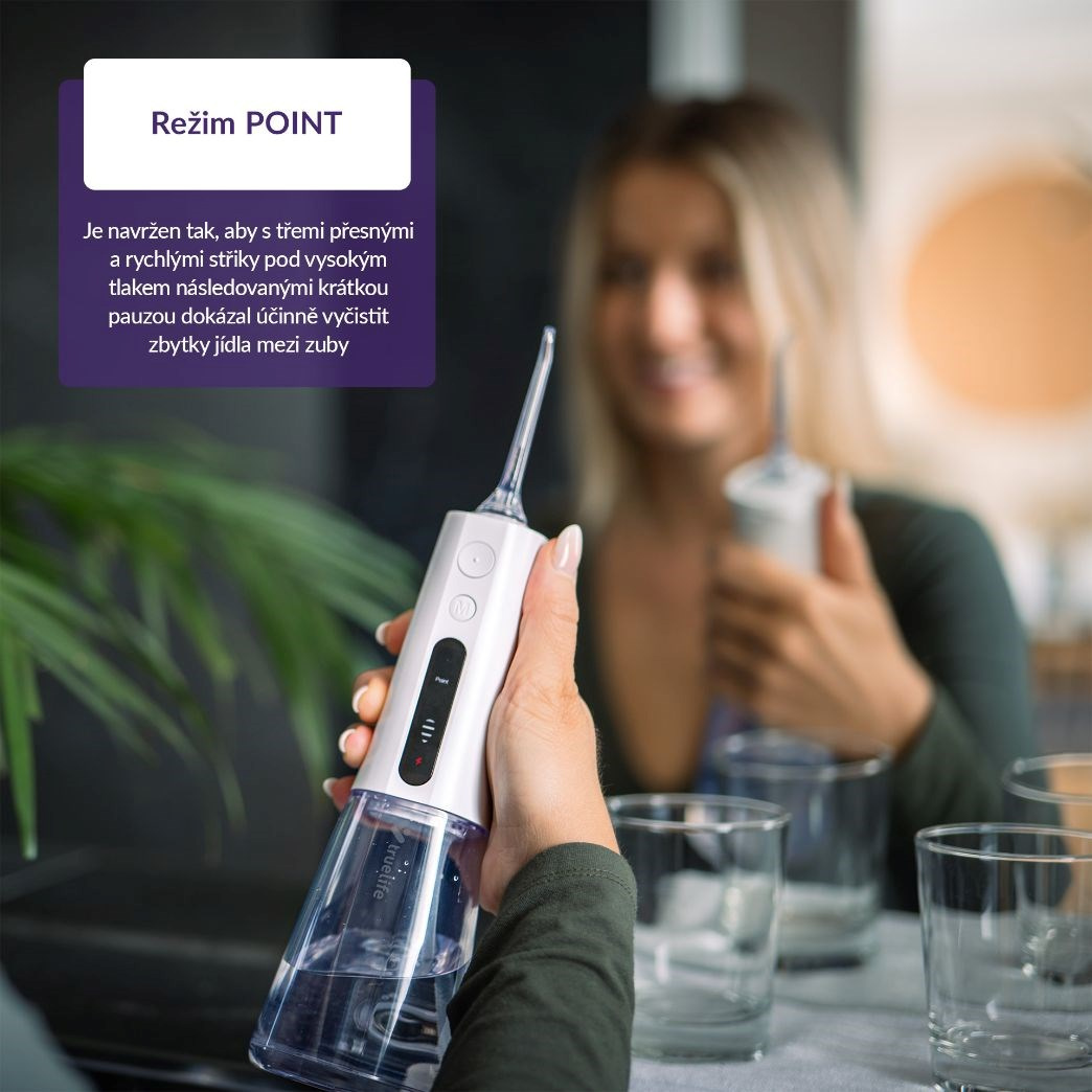 Medzizubné priestory bývajú rajom baktérií, ktoré sú príčinou zubných kazov. Najúčinnejšie sa ich zbavíme každodenným čistením nielen zubov, ale práve aj priestoru medzi nimi. Špeciálne kefky či zubná niť nemusia byť práve komfortné a ich neustále nakupovanie pociťuje náš peňaženka. Šetrnejšie riešenie vo všetkých smeroch predstavuje ústa sprcha TrueLife AquaFloss Compact L100 disponujúca 3 režimami čistenia, predovšetkým režimom POINT, ktorý cielene a účinne odstráni zvyšky jedla z medzizubných priestorov. 300ml nádržka s dvojitým plnením, zhora aj zozadu, pohodlne vydrží na dvojminútové čistenie, ktoré stráži integrovaný časovač. Praktické je