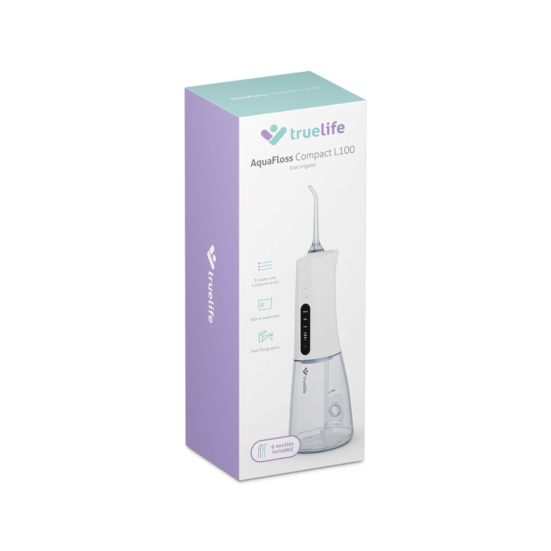 Ústna sprcha TrueLife AquaFloss Compact L100 ponúka oveľa pohodlnejší a šetrnejší spôsob čistenia medzizubných priestorov než zubná niť či medzizubné kefky. Navyše šetrí peniaze, pretože nie je potrebné tieto komponenty stále dokupovať. 300ml nádržku naplníte shora alebo z boku vodou, zvolíte jeden zo 3 režimov čistenia a technológia StreamTrue® sa postará o účinné odstránenie zubného