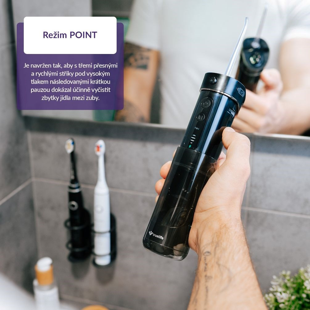 Doslova rajom pre baktérie sú v ústnej dutine medzizubné priestory. Chrániť zuby pred zubným kazom môžeme dôkladným čistením aj týchto ťažko dostupných miest. Ústna sprcha TrueLife AquaFloss Mini M50 Black je praktickým a komfortným pomocníkom. Poskytuje maximálne efektívne riešenie vďaka 3 režimom čistenia so 4 intenzitami tlaku pre každý z nich a technológiu StreamTrue®, ktorá odstráni až 99% povlaku a nečistôt. Technológia PulseTrue® príjemne masíruje ďasná a prispieva k ich regenerácii. Funkcia pamäť si zapamätá posledný použitý režim. Sprcha je novo vybavená aj jedinečnou tryskou Bubble Spraying technológiou, ktorá rozpráši vodu po celej ploche zuba. Nádržku s objemom 180 ml ľahko naplníte 3 rôznymi spôsobmi a hlavica otočná o 360° je zárukou, že sa dostanete do každého zákutia. Ústna sprcha je skvelá na doma, ale aj na cesty vďaka teleskopickému telu, koženkovému púzdru, možnosti uschovať trysku v hornej časti sprchy a výdrži batérie 12 dní.