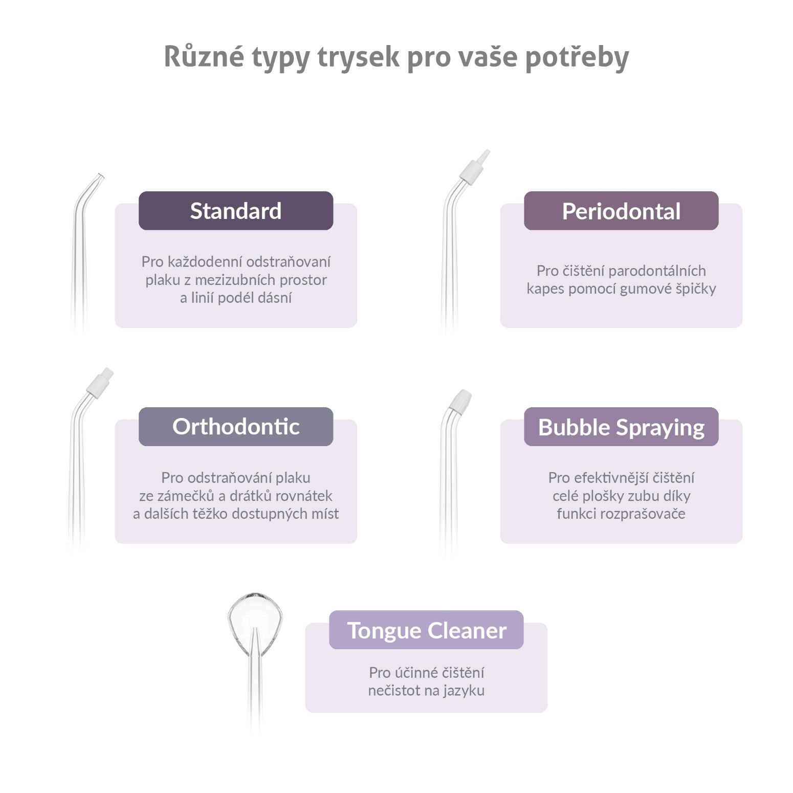 Súčasťou balenia ústnej sprchy je 6 rôznych druhov trysiek M-series, takže ju môže využívať celá rodina. Ďalšie trysky pre rôzne dentálne potreby je možné dokúpiť.