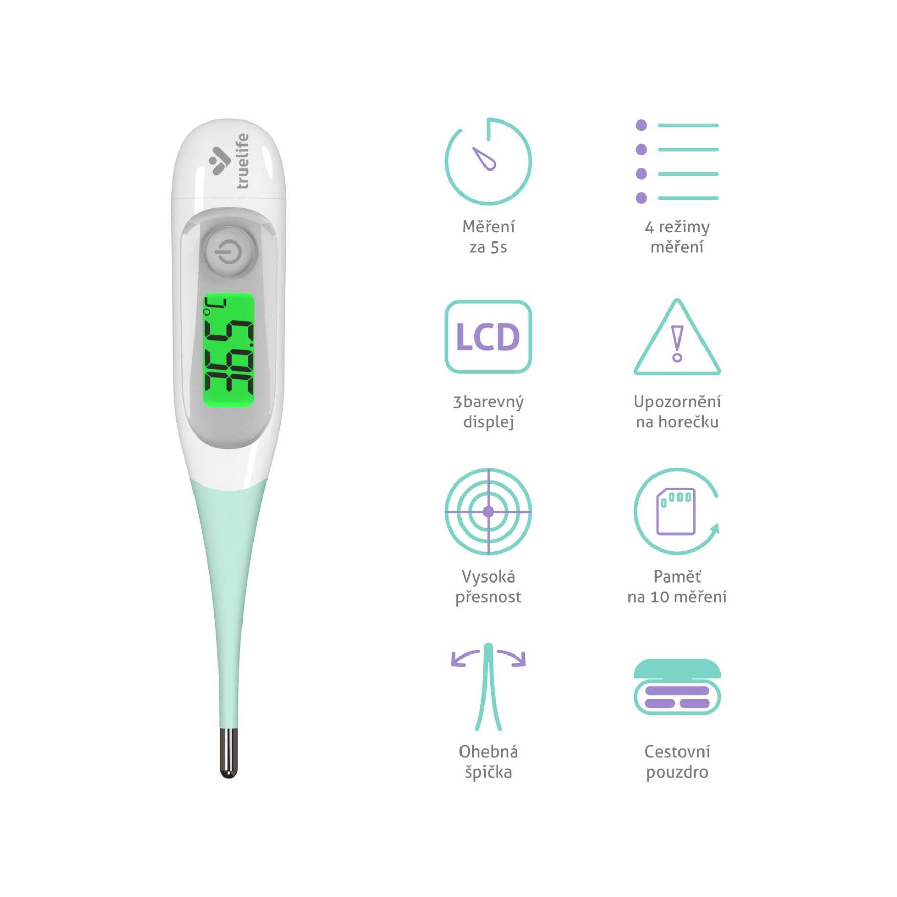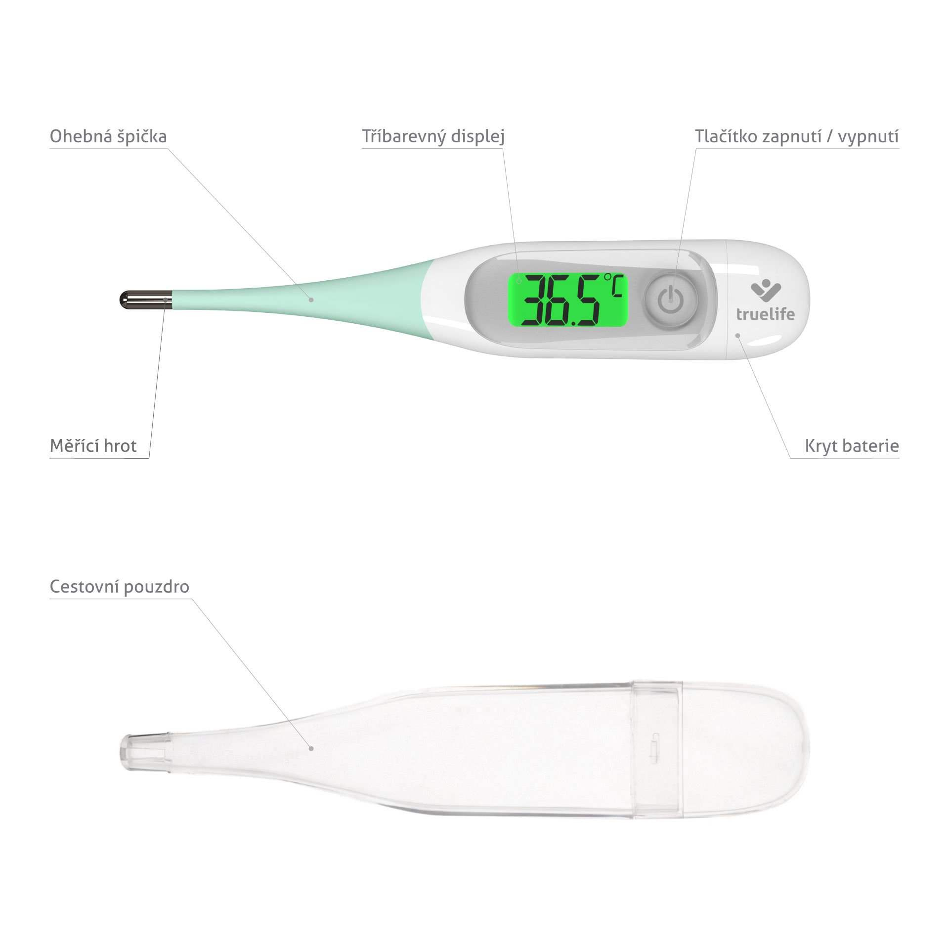 Ak patríte skôr ku vyznávačom klasiky, iste vás poteší kontaktný teplomer TrueLife Care T3. Dopĺňa portfólio bezkontaktných teplomerov TrueLife a je dôkazom, že aj klasiku je možné pojať moderne. Tento spoľahlivý digitálny teplomer s ohybnou špičkou zmeria teplotu už za 5 sekúnd, a to veľmi presne. Namerané hodnoty hneď vidíte na dobre čitateľnom displeji, ktorý mení podsvietenie podľa teploty. Teplomer šetrne zmeria teplotu na troch miestach tela, hodí sa teda pre bábätká aj dospelých, a umožňuje tiež meranie teploty vody. TrueLife Care T3 neobsahuje ortuť, sklo a žiadne škodlivé látky, bez problémov ho teda zbalíte do cestovného puzdra a môžete sa vydať kamkoľvek. Navyše batéria vydrží až 1000 meraní.